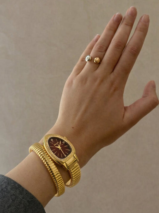 Ruby Dial Spiral Serpenti Gold Watch-Style Bracelet with CZ Stones