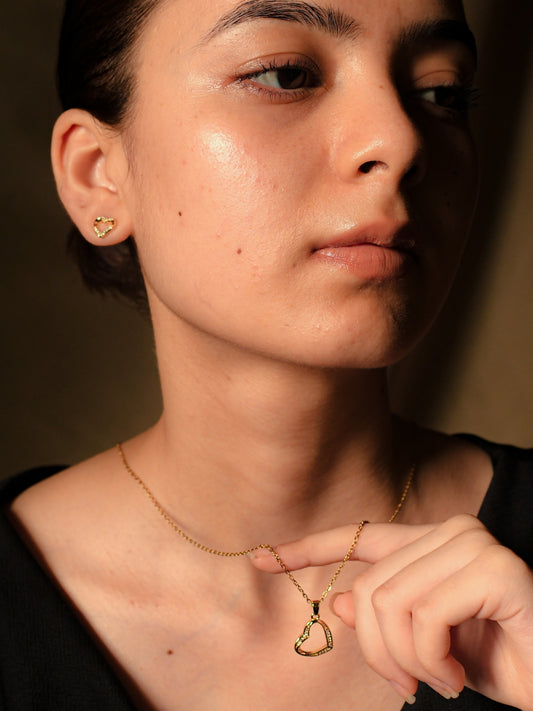 Heart Studded Minimal Jewelry Set – Dainty Gold Necklace & Earrings
