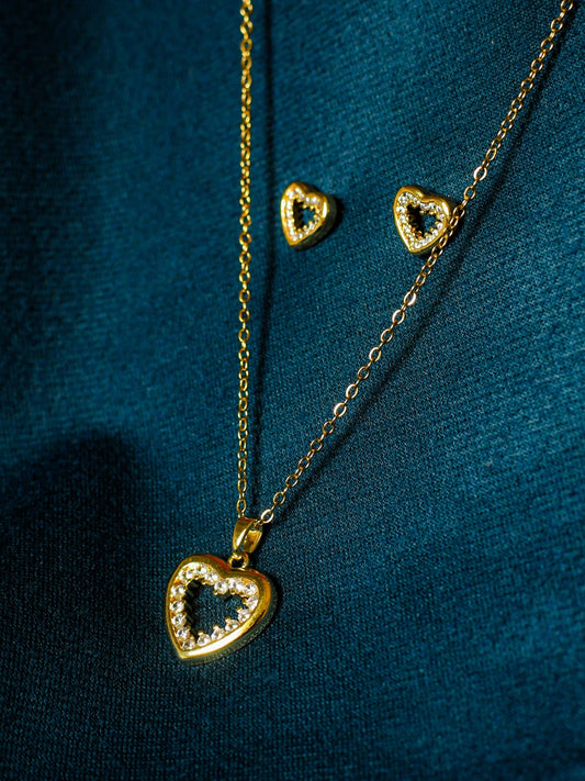 Dainty Heart Studded Jewelry Set – Gold-Plated Necklace & Earrings