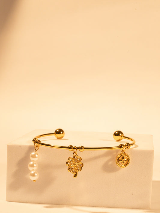 18K Gold-Plated Clover Charms Bracelet – Stainless Steel, CZ Stones & Pearl Charms, Anti-Tarnish & Hypoallergenic