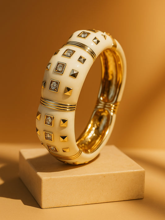 Cream Enamel Studded Bracelet in 18K Gold | CZ Stone Statement Bangle