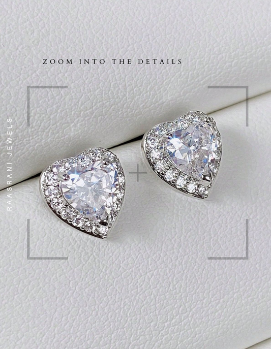 Silver Heart Stud Earrings – Rhodium Plated, Anti-Tarnish, Hypoallergenic, Premium AD Stones (Stainless Steel)