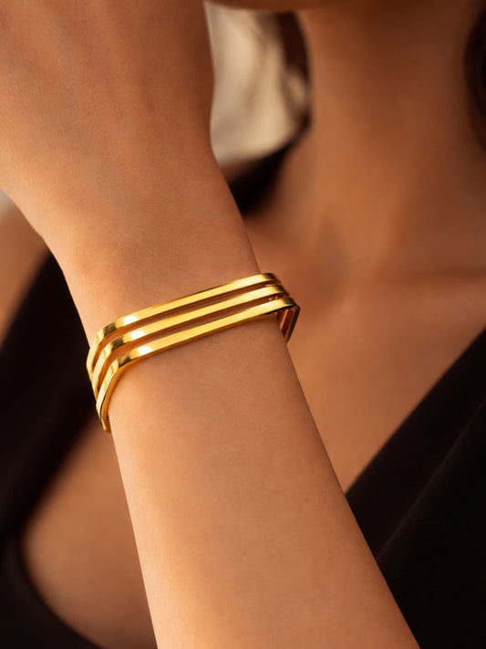 18K Gold Tri-Line Open Cuff Bracelet | Anti Tarnish Stainless Steel