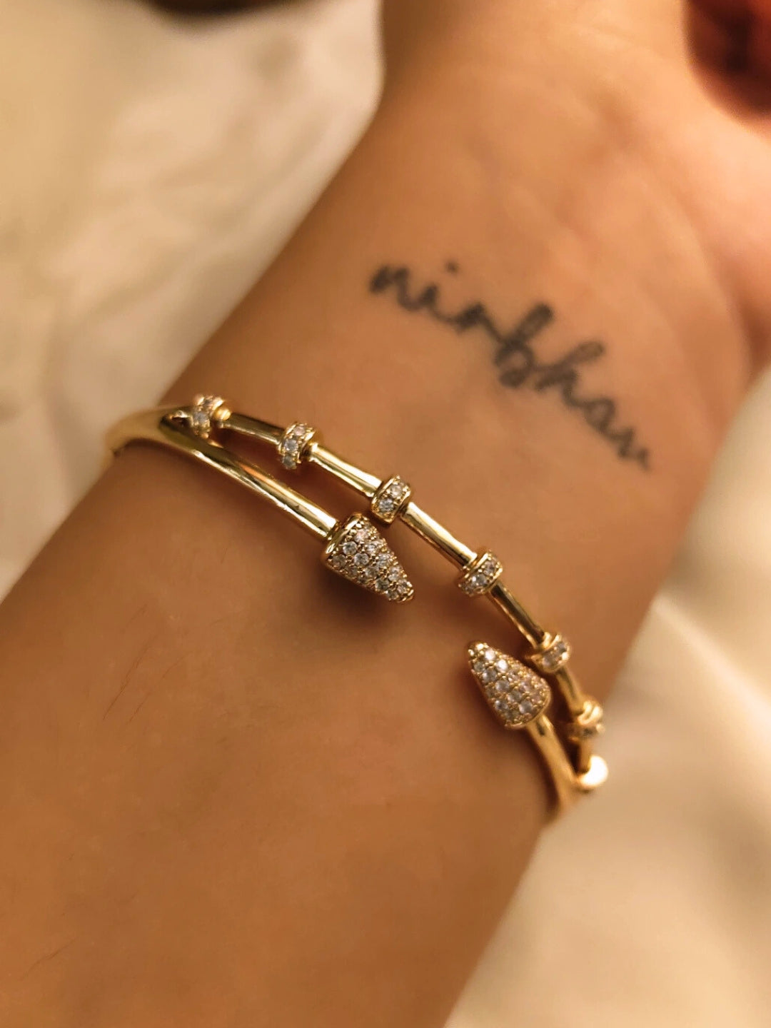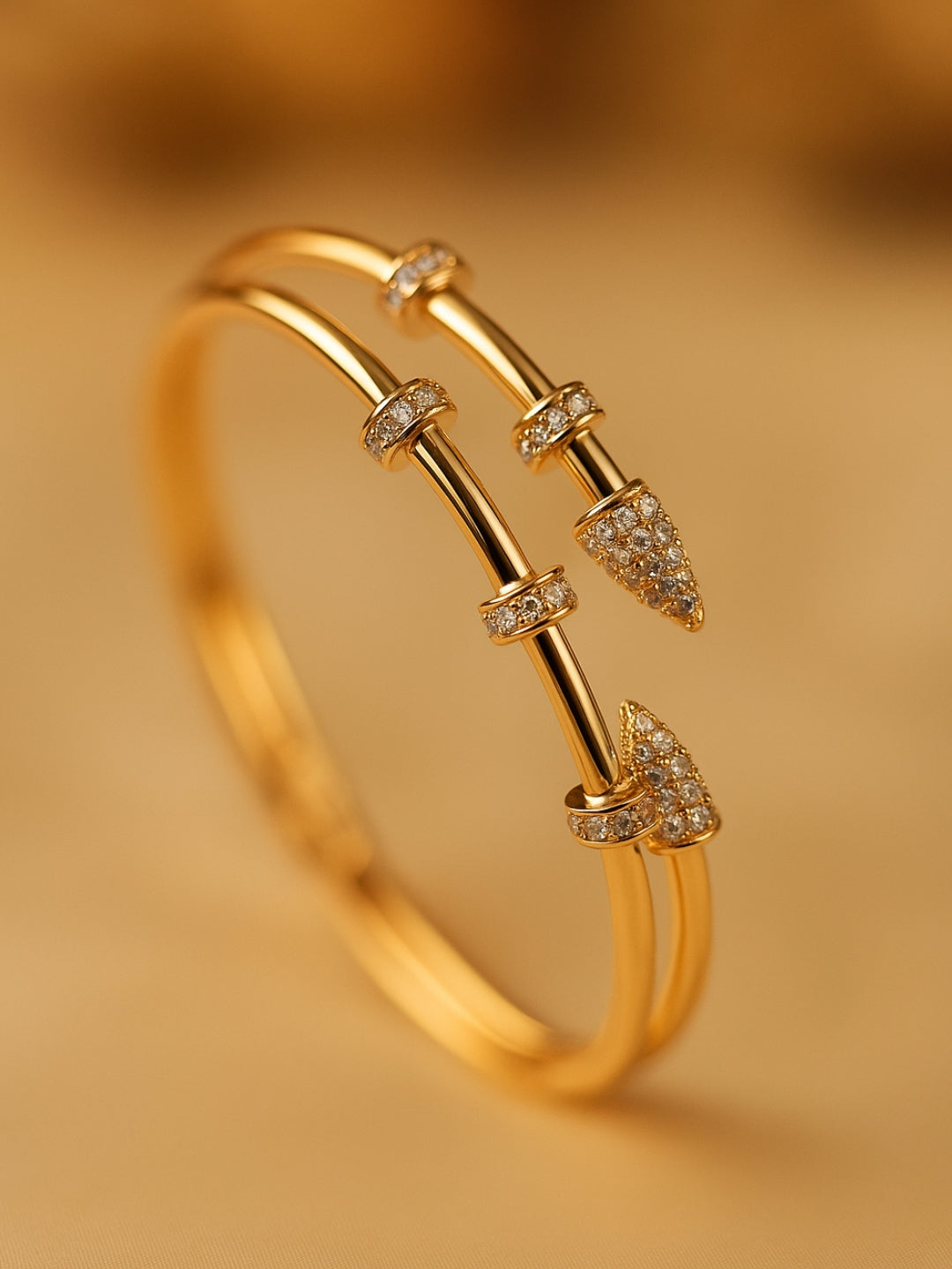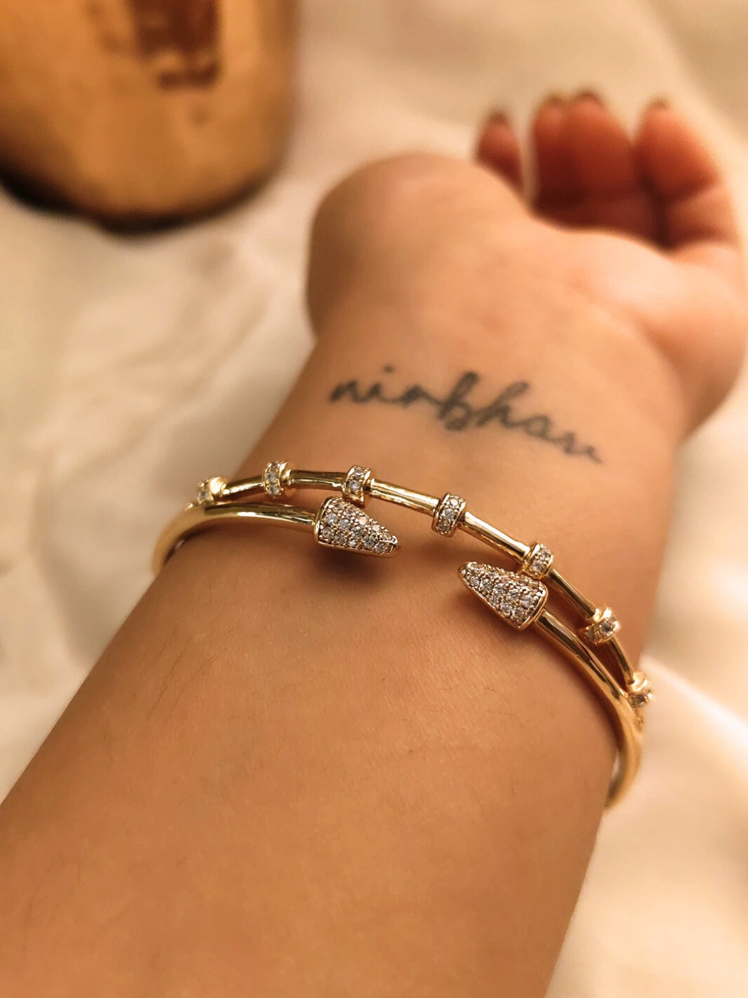 Strike the perfect balance between edgy and elegant with our Arrow Studded Cuff. Featuring pointed arrowhead motifs adorned with premium AD stones, this bracelet is a modern classic that brings bold energy to your jewelry stack. Crafted using 316L stainless steel and plated in luxurious rose gold, it offers durability without compromising style.
