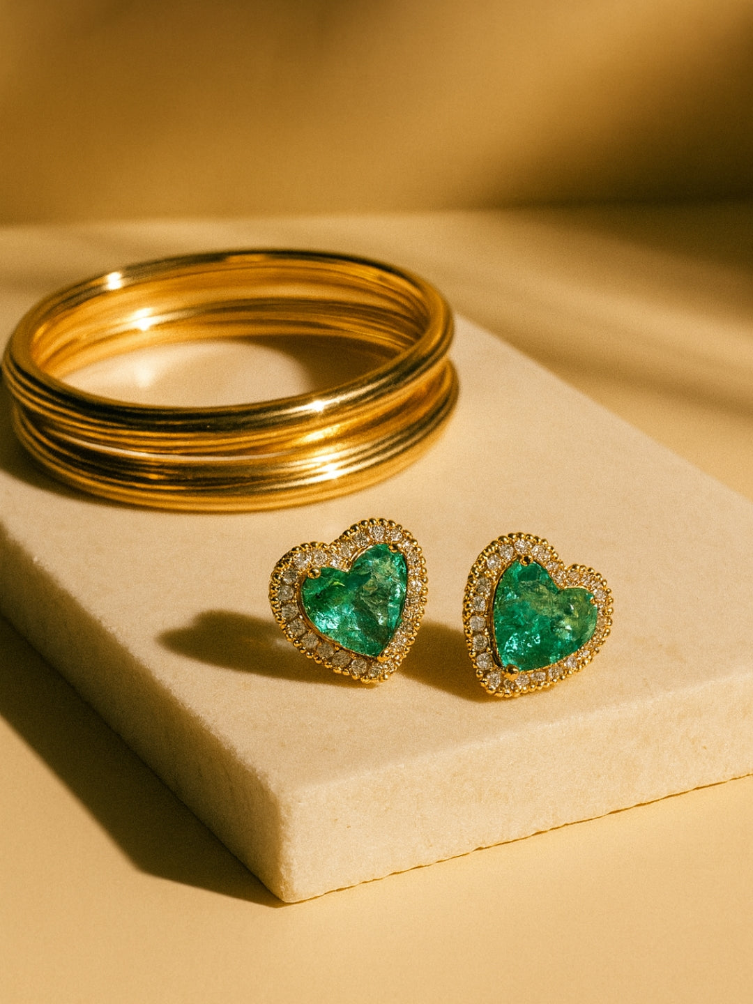 Fall in love with elegance all over again with these Emerald Doublet Stone Heart Stud Earrings, expertly crafted to add a timeless charm to your jewelry collection. Shaped in a delicate heart design, these studs feature premium emerald doublet stones framed with sparkling American Diamonds (AD) for just the right touch of luxury.