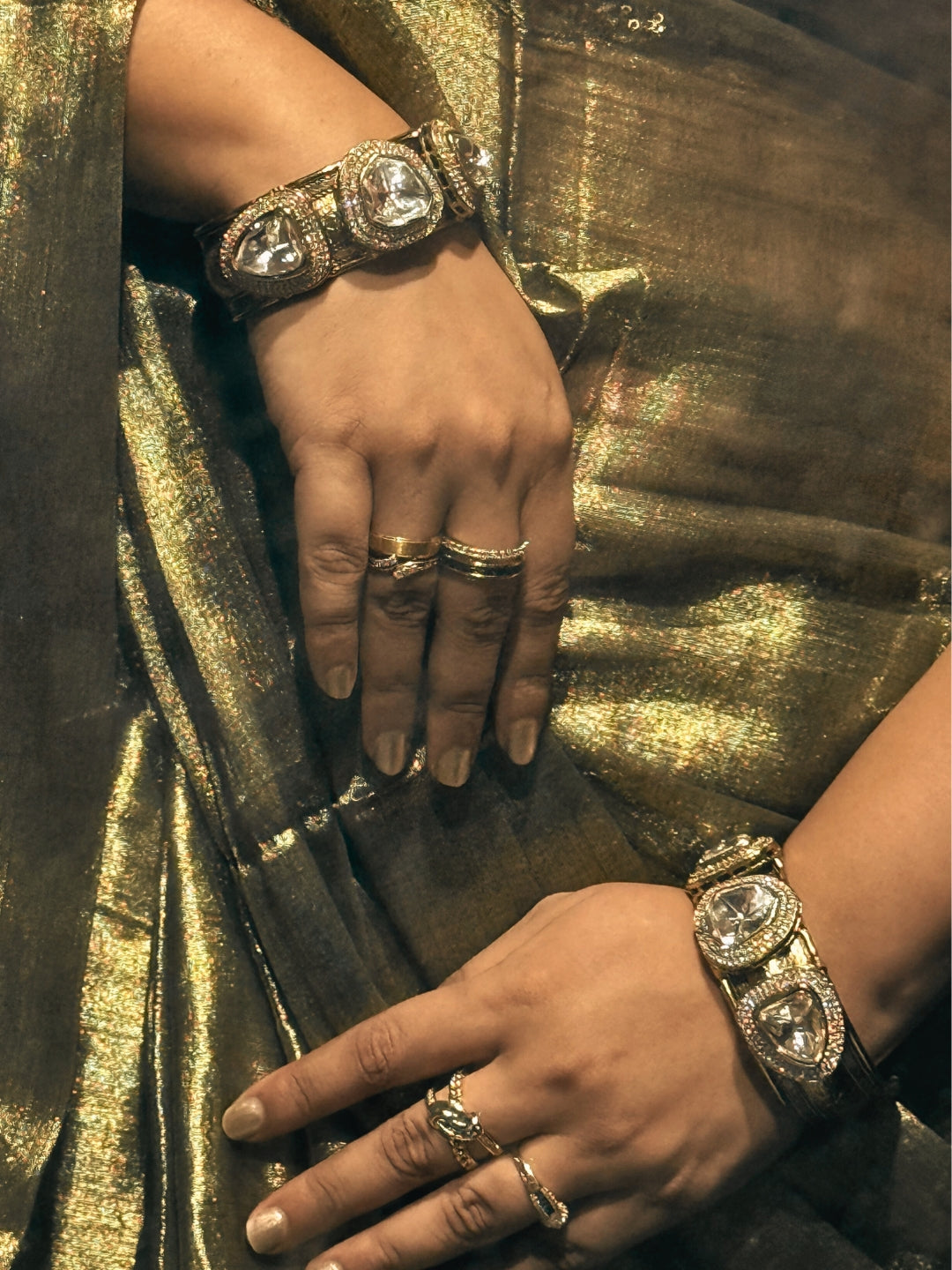 Whether you're styling it with ethnic outfits, partywear or minimalist Western outfits, this gold moissanite kada adds a touch of sophistication to every look. Tarnish-resistant and skin-friendly, it's a must-have in your jewellery collection.