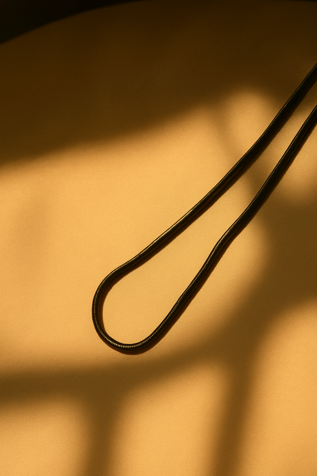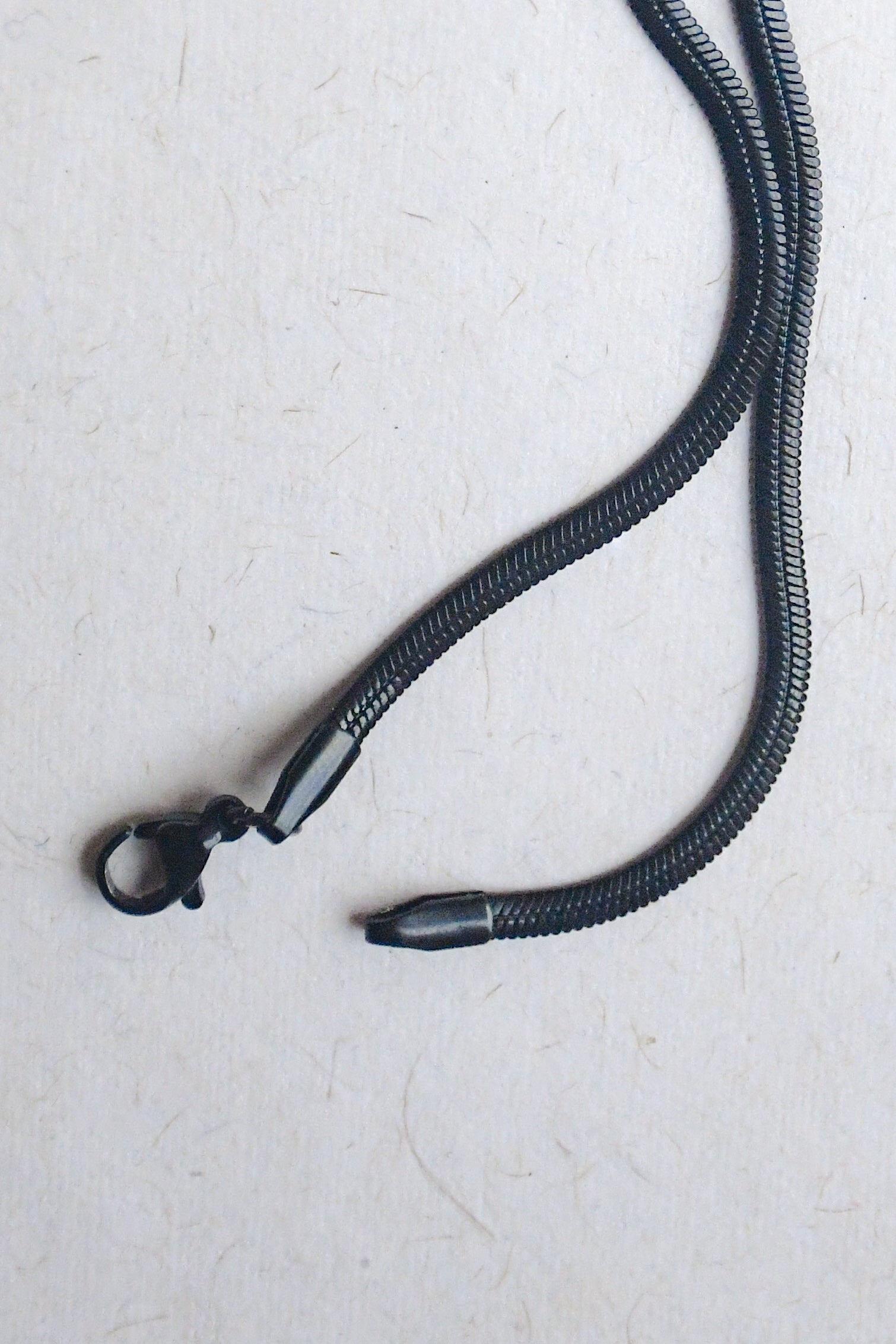 The Black Snake Chain is a razor-sharp staple designed for men who live by the “less is more” mantra. Crafted in stainless steel and finished with a stealth black polish, this chain sits flush on the skin with a clean, fluid silhouette.